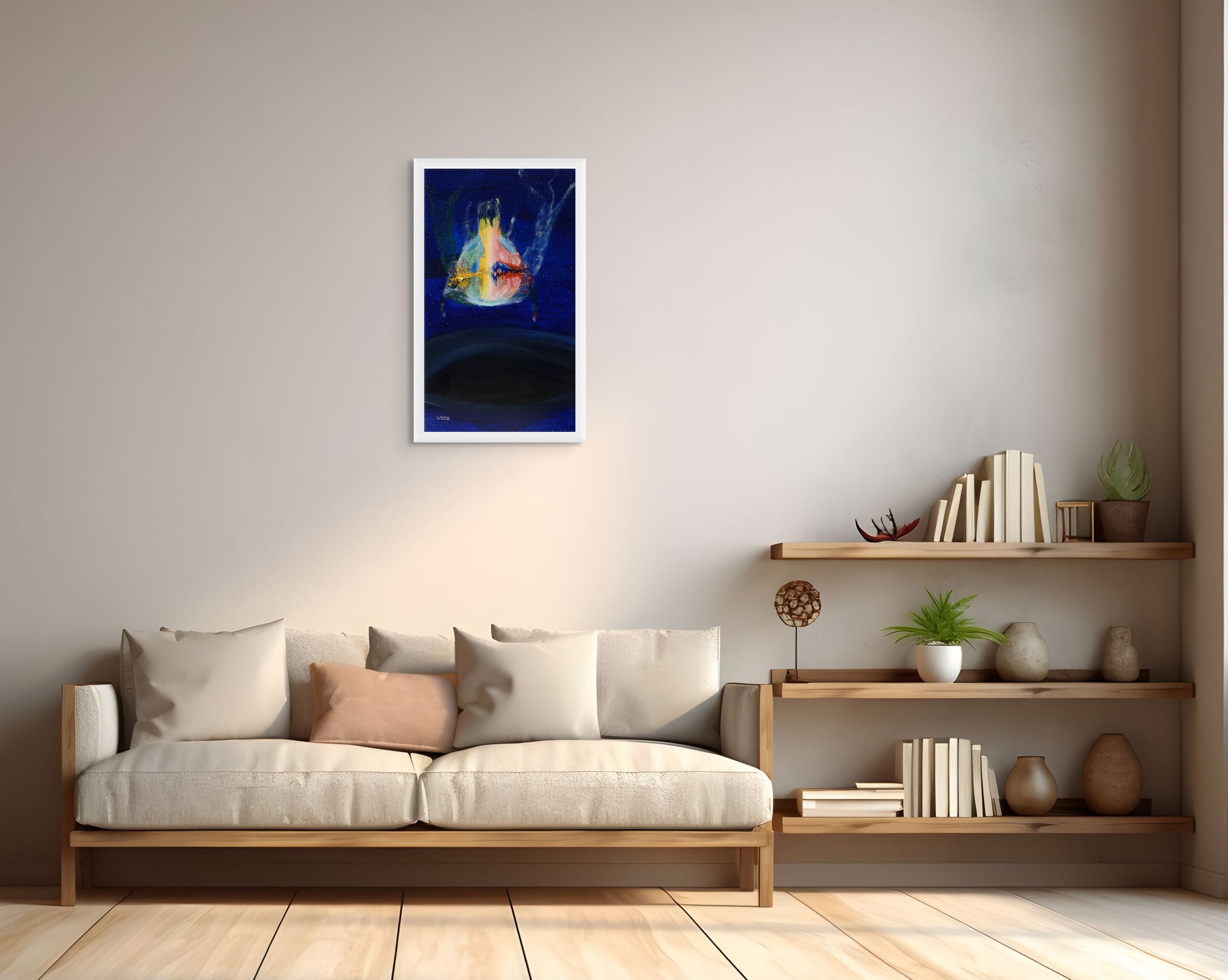 You can see what the Original Artwork looks like in your own space. You can interact with the artwork in your space, using Augmented Reality. You can upload a photo from your room, or just view it in a mockup space. Click the options bellow to start!